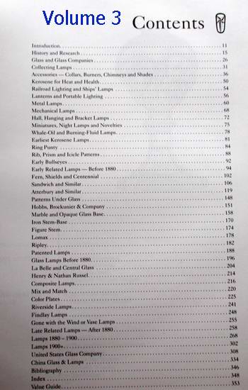 Description:.........Volume 3 is packed with information and photographs heretofore never in print. Included are sections on Fostoria lamps, hanging lamps, bracket lamps, composites, burners, shades, etched chimneys, parlour lamps, metal lamps, and a wide variety of ornate all-glass table lamps. It is aptly described by the publisher as a "visual feast." Stunning photos and includes a price guide.(wt.=2lb. 10oz.; $3.03 shipping)
