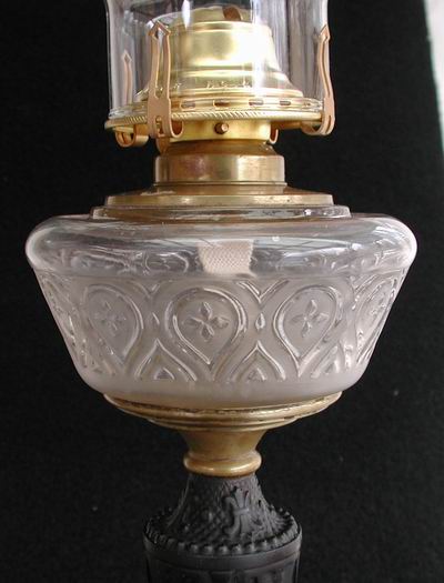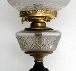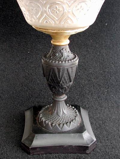 This handsome parlor lamp has survived almost unscathed from the Civil War era (there is some rust on the bottom of the iron base). I rented this lamp for use in Novmeber 2009 as an authentic Victorian scene prop for the Robert Redford movie production of "The Conspirator." This film depicts the role of Mary Surrat, one of those who planned the assassination of Lincoln. She was the first woman executed in the U.S.